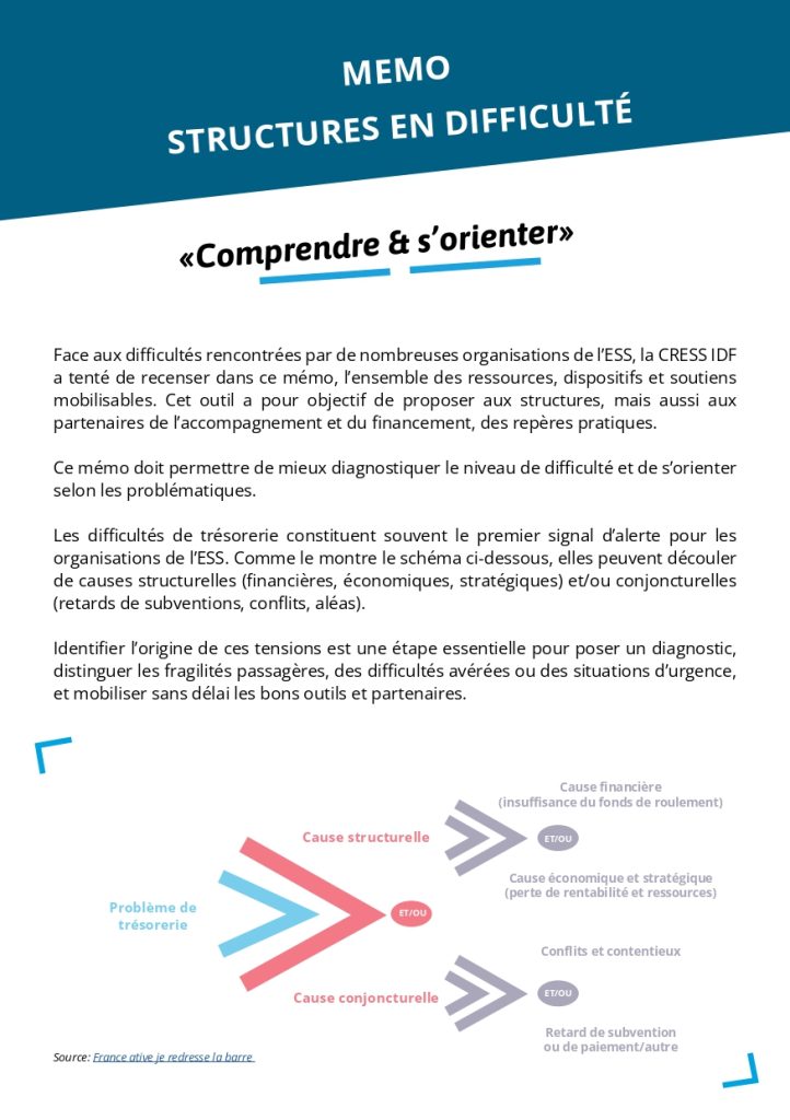 Ce mémo doit permettre de mieux diagnostiquer le niveau de difficulté de la structure et de l’orienter selon les problématiques. Les difficultés de trésorerie constituent souvent le premier signal d’alerte pour les organisations de l’ESS.